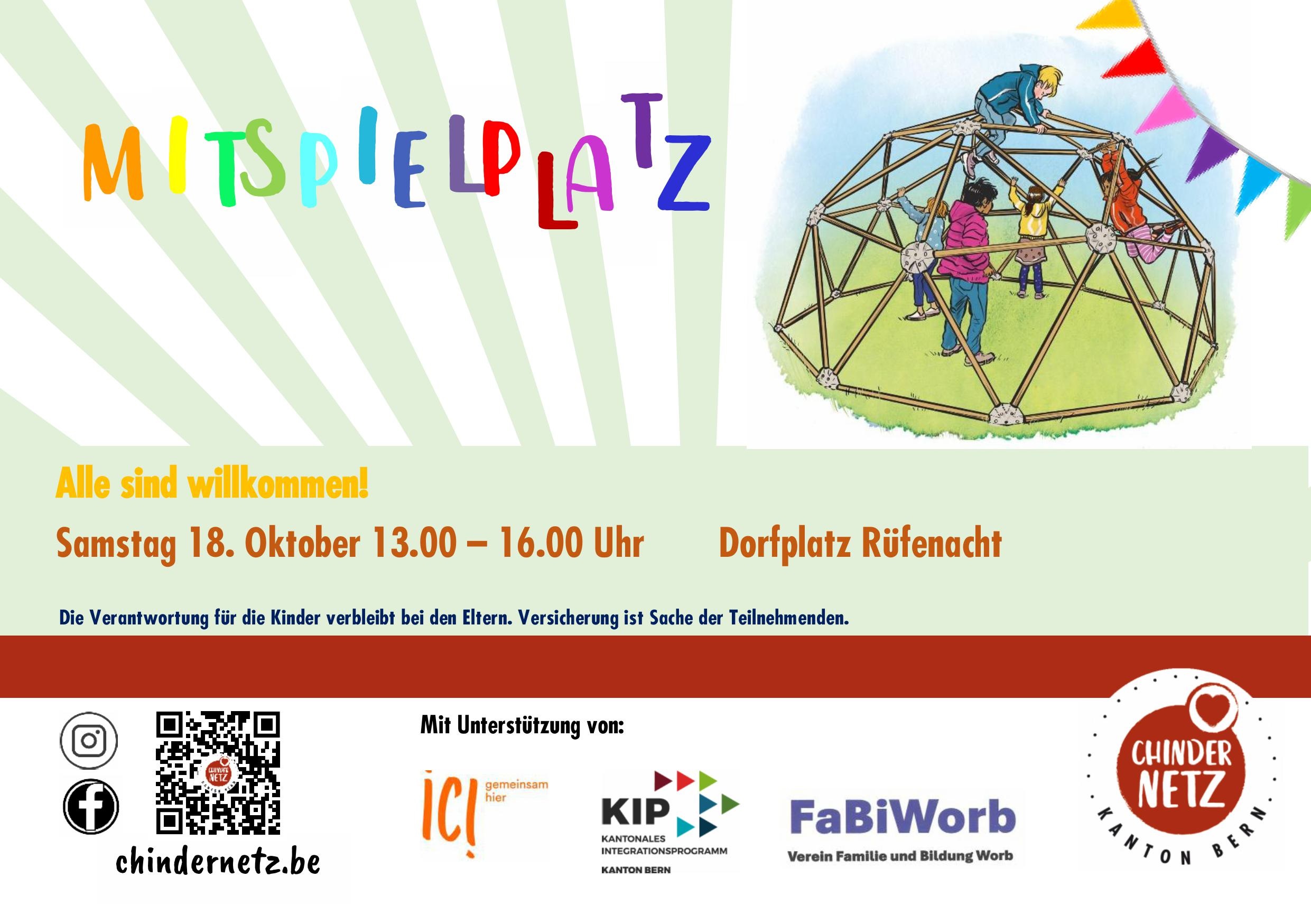 Unbeschwertes Spielen, Klettern, gemeinsam etwas auf- und abbauen, Eltern, die miteinander plaudern können - dies bietet der MitSpielplatz mit Livingdome auf dem Dorfplatz. Der gemeinsame Aufbau des Klettergerüst fördert das Miteinander von Kinder (und Eltern) und bietet viel Möglichkeiten zum herumturnen, während die Eltern Gelegenheit haben Informationen und wertvolle Tipps von Fachpersonen zu erhalten. Alle sind willkommen, auch Grosseltern, Tanten, Onkel, Betreuungspersonen jeglicher Art mit ihren Kindern.