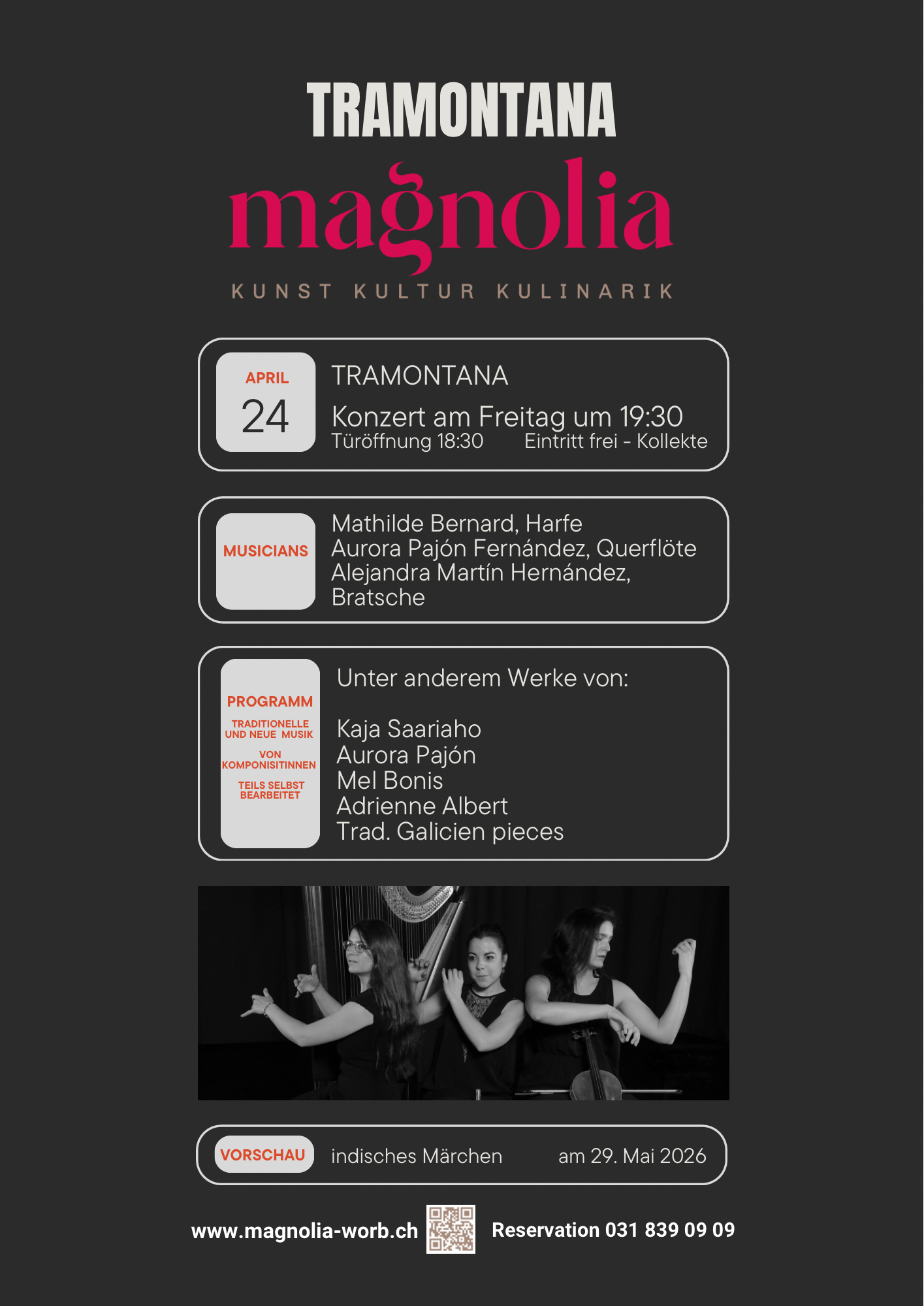Das Trio Tramontana mit den drei Musikerinnen Bernard (Harfe), Pajón (Querflöte) und Martín (Bratsche) spielt wunderbare moderne und klassische Stücke von Musikerinnen wie Kaja Saariaho, Aurora Pajón , Mel Bonis, Adrienne Albert uam.